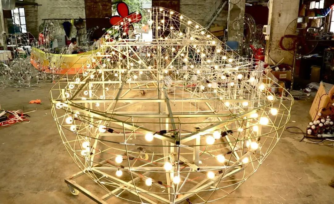 在骨架搭制阶段,所有铁丝都是使用扎带固定,方便后续改动。一旦确认造型后,焊工师傅便开始焊接加固、定型。此步骤还需要师傅进行多次检查,做到不漏掉一个焊点。