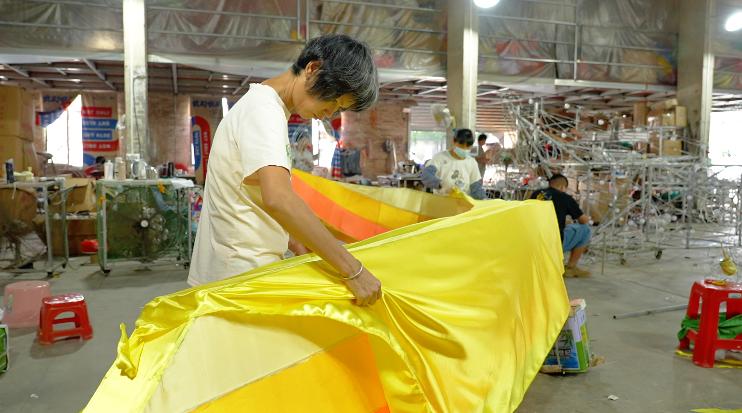 一辆彩车的绚丽还需要多彩的色布组合呈现。师傅们会按照图纸要求,在每一件彩车组件上用布条或色布套上,组件裱好后要对色布相交合处用金灿灿的金边沿边装饰。