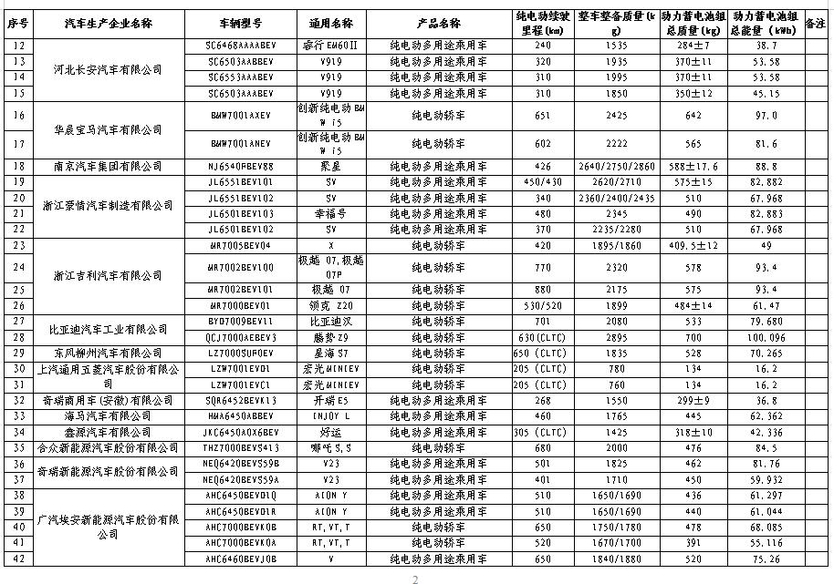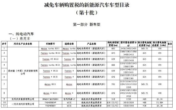 减免车辆购置税的新能源汽车车型目录(第十批)纯电动汽车-乘用车车型如下: