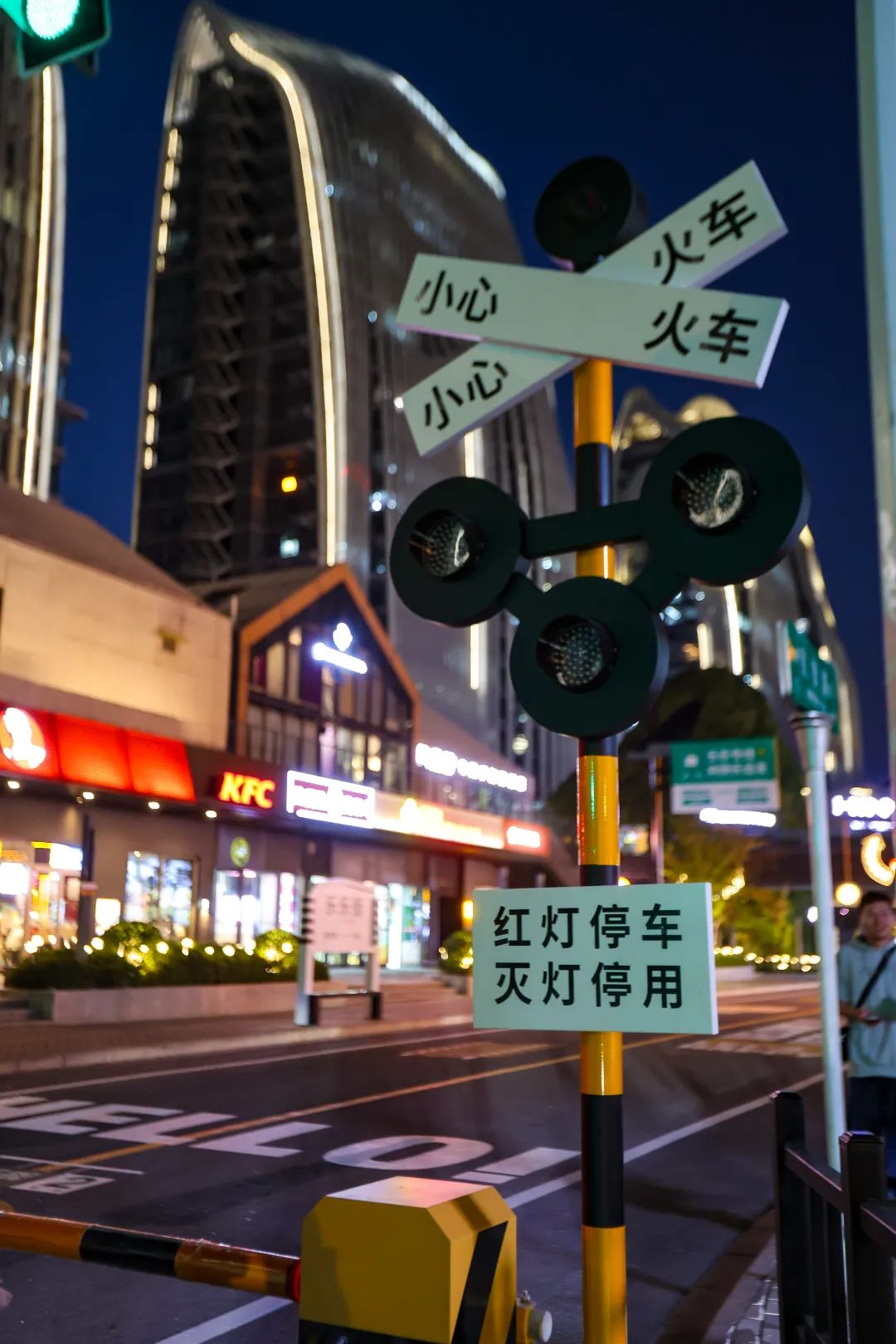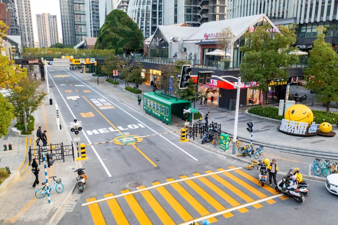位于南京南站商业中心区民智路的乐乐街,街区入口处设计成了火车站的模样,有一节绿皮车厢,往里面走,远远就看到天桥上的黄色笑脸图案。