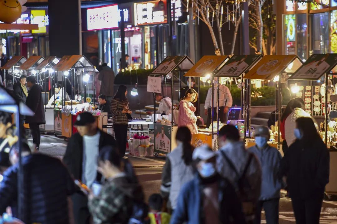 小吃、饮料、文创……沿街的摊位各有特色,闪烁的装饰灯与浓浓的烟火气,吸引着许多周边居民和游客打卡拍照、边逛边吃。