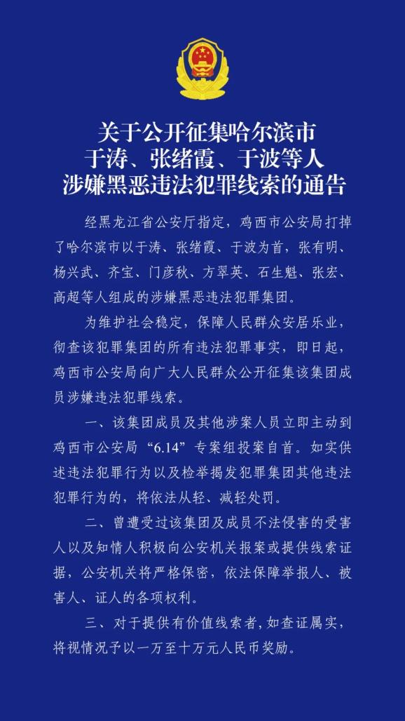 10月14日,黑龙江省鸡西市警方发布通告,公开征集哈尔滨市于涛、张绪霞、于波等人涉嫌黑恶违法犯罪线索。