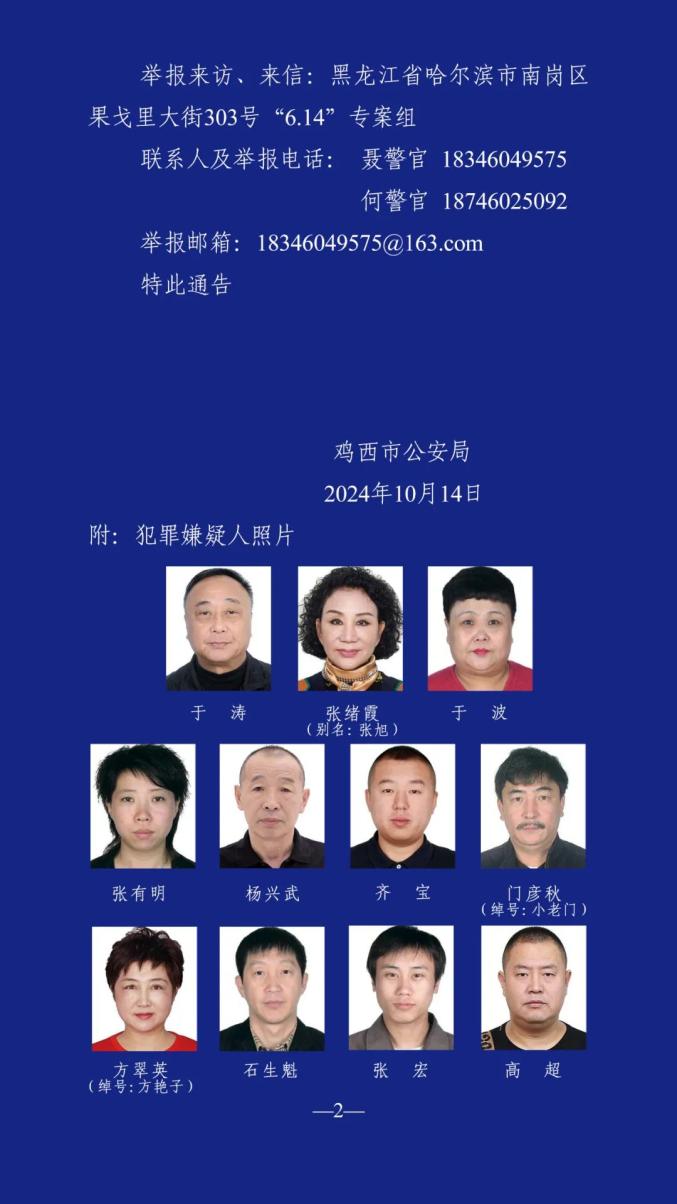 鸡西警方发布通告称,经黑龙江省公安厅指定,鸡西市公安局打掉了哈尔滨市以于涛、张绪霞、于波为首,张有明、杨兴武、齐宝、门彦秋、方翠英、石生魁、张宏、高超等人组成的涉嫌黑恶违法犯罪集团。为维护社会稳定,保障人民群众安居乐业,彻查该犯罪集团的所有违法犯罪事实,即日起,鸡西市公安局向广大人民群众公开征集该集团成员涉嫌违法犯罪线索。对于提供有价值线索者,如查证属实,将视情况予以一万至十万元人民币奖励。