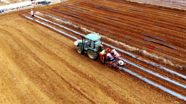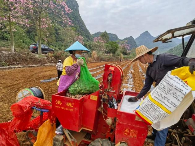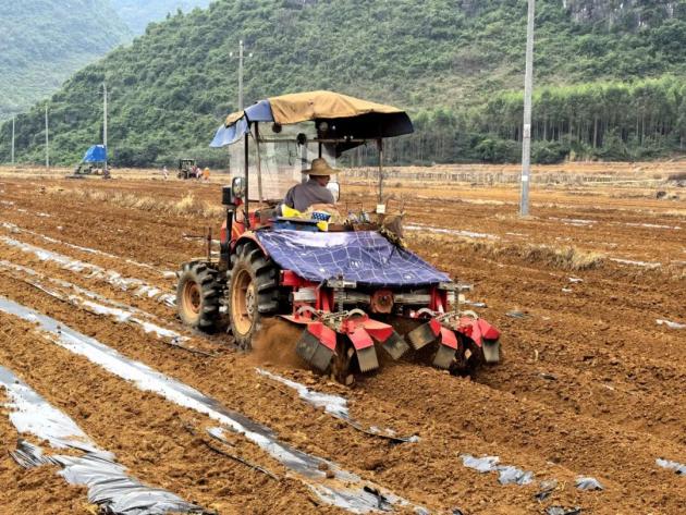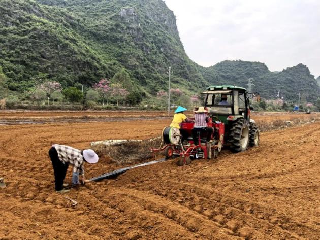 在武宣县禄新镇长岭村的1200亩“旱改水”高标准农田现场,耙田机、土豆种植机、培土机正在田里轮番协作,呈现眼前的是一副如火如荼的冬种场景。耙田机先将土地翻整,让土壤变得稀疏松软;土豆种植机紧随其后在人工协作下,将土豆种子、化肥一起种到土里,盖上薄膜;最后培土机挖沟填土,不到10分钟,两陇土豆便完成种植。