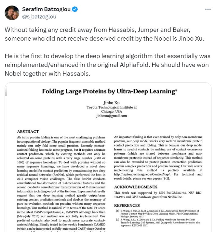 他转发了诺贝尔化学奖的贴文并评价说,“并不是要否定哈萨比斯、朱默帕和贝克的贡献,但还有一个人本应得到诺贝尔奖的认可,那个人就是许锦波。他第一个开发出(精准预测蛋白结构)的深度学习算法,这一算法后来被复现和增强到最初版本的AlphaFold中。他本应与哈萨比斯一起获得诺奖。”