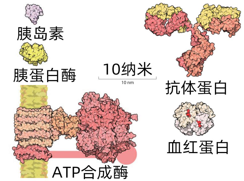 一些蛋白质的大小对比 。蛋白质分子的直径经常也就几纳米或者几十纳米,胰岛素只有51个氨基酸;助消化的胰蛋白酶有281个氨基酸;运氧气的血红蛋白有574个氨基酸;再大一点的有免疫系统用来对抗细菌病毒的抗体蛋白(1316个氨基酸),以及线粒体里提供能量的ATP合成酶(1125个氨基酸)。蛋白质是由氨基酸构成的。想象一下,你有20种不同形状和颜色的柔性积木,每种积木可以无限量供应,那就是生物合成蛋白质所普遍使用的20种氨基酸。你能用这些积木搭出的不同形状,就相当于蛋白质的不同结构。