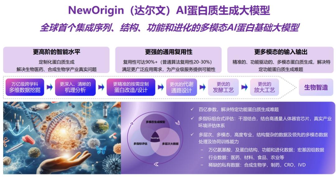NewOrigin,达尔文,这个名字的意思是,这将是一次AI驱动的新物种起源。蛋白质的进化,将从大自然的随机进化,变成AI设计的定向进化。在一项与药企的合作中,达尔文大模型对野生型蛋白进行突变设计,优化蛋白的稳定性、表达量等多个目标,仅仅三天就设计出数十个理想的候选蛋白,动物实验显示,疫苗产生中和抗体滴度为已公开专利和相关大型药企蛋白疫苗的数倍。