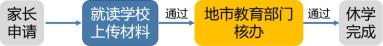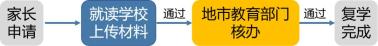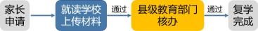 学生完成1周年休学后,由家长向就读学校提出复学申请,就读学校审核佐证材料并上传平台,经相关教育部门审核确认后,完成复学手续。
