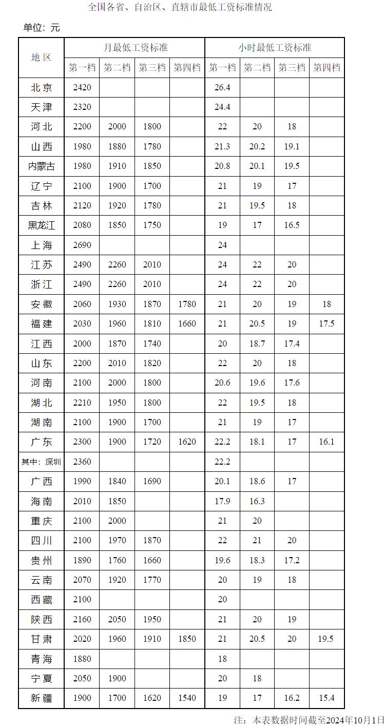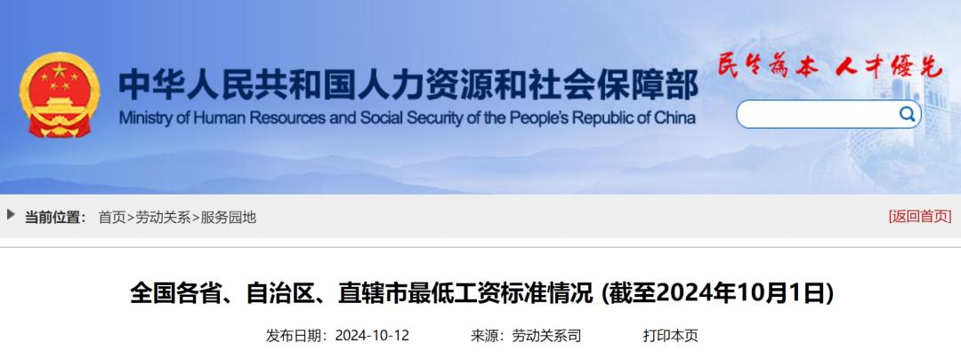 日前,人社部网站公布了全国各省、自治区、直辖市最低工资标准情况(截至2024年10月1日)。