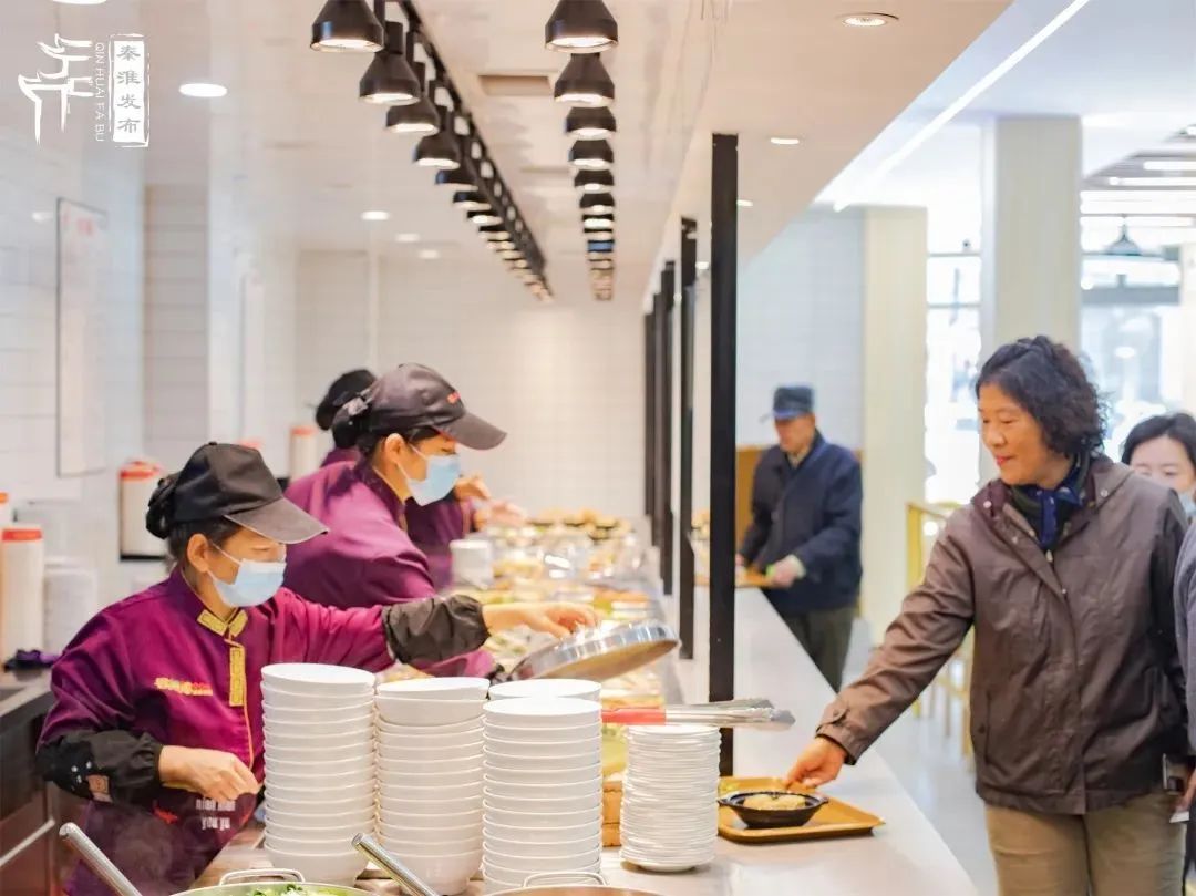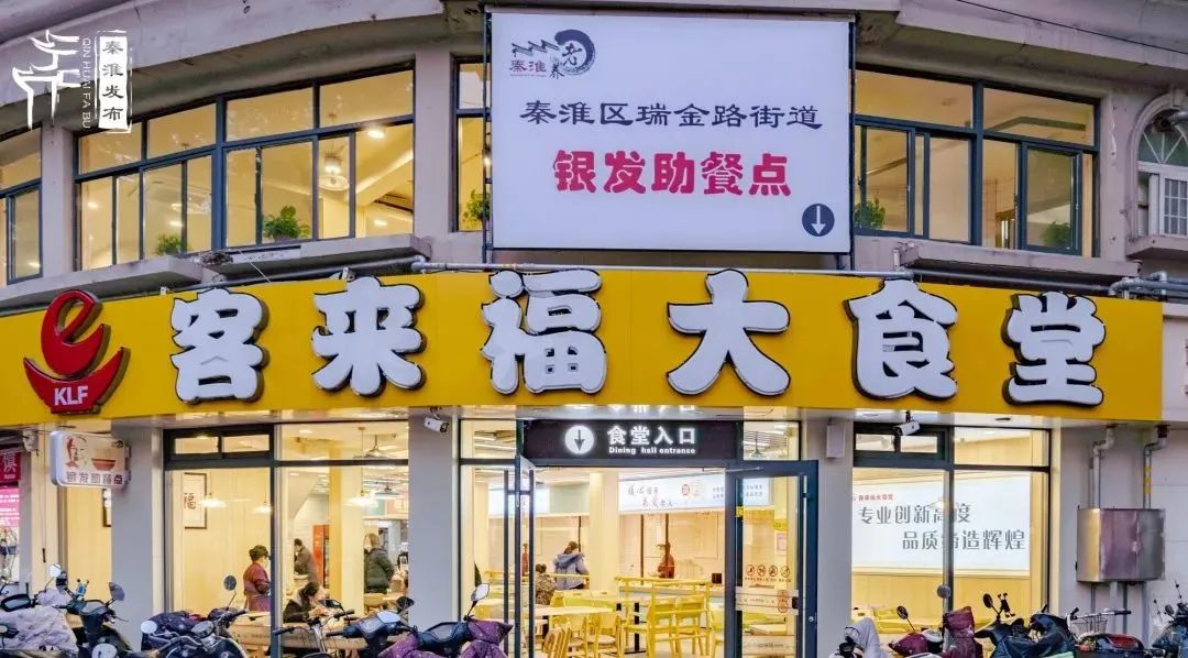 在秦淮首家“社会化餐饮+银发助餐”试点客来福大食堂(瑞金店)内,就餐的老人络绎不绝。