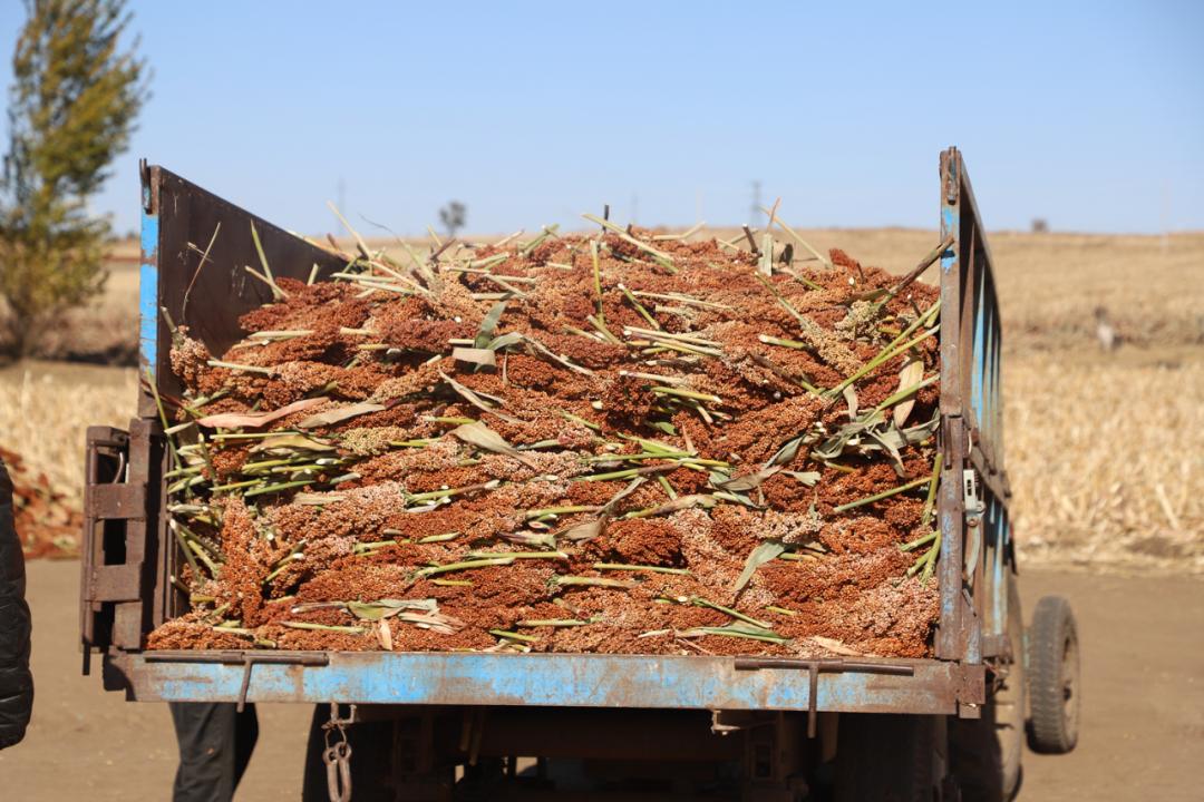 走进水泉镇龙泉村的田间地头,一株株红高粱高高挺立,硕大的穗头低垂,压弯了枝腰,宛如一片火海,高粱层层叠叠,随风摇曳。村民们手握镰刀在田间来回穿梭,动作娴熟地削下高粱穗,边割边将高粱穗扔进车里,不一会儿车斗里就铺满了火红的高粱穗,一幅忙碌而充满希望的画面展现在眼前。