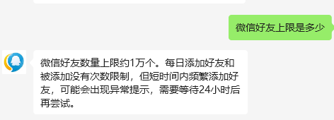 腾讯客服表示,微信好友数量上限约1万个。每日添加好友和被添加没有次数限制,但短时间内频繁添加好友,可能会出现异常提示,需要等待24小时后再尝试。