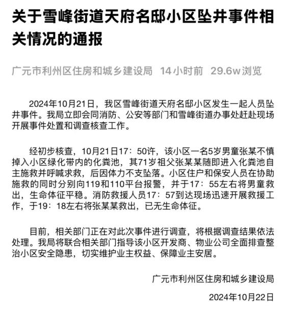 目前,相关部门正在对此次事件进行调查,将根据调查结果依法处理。据媒体报道,小区业主称,出事的化粪池之前曾施工作业,结束后仅用一块木板盖住井口,时间久了木板有些腐朽。