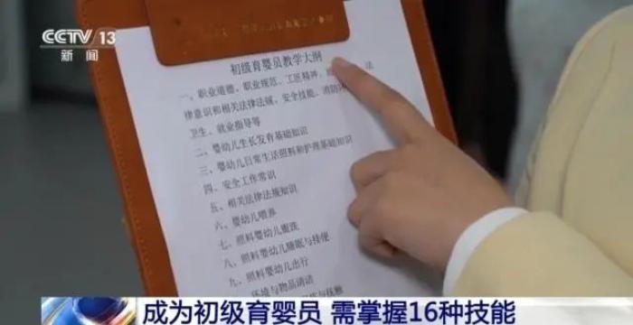 总台央视记者唐蕾:从初级育婴员培训大纲中我们看到,仅仅是初级育婴员培训就有十六项,其中还涉及了一些早教内容,包括训练孩子的听说能力、运动能力。
