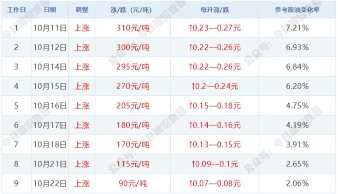 10月22日,本轮国内油价计价统计周期第9个工作日,距离调价仅剩最后1个计价统计日,当前参考原油变化率为2.06%,预计汽柴油价格上调90元/吨,折算为每升油价上涨0.07-0.08元。调价时间:10月23日24时(明晚12点)!