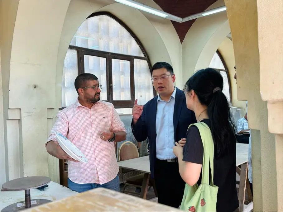 代表团赴福斯塔特传统手工艺中心进行调研代表团还拜会了中国驻埃及大使馆经商处,双方深入探讨了中国与埃及在双边贸易、文化贸易方面的合作成果和未来机遇,落地项目的相关政策等问题。经商处负责同志表示欢迎并希望越来越多的中国文化企业能在埃及开展合作。