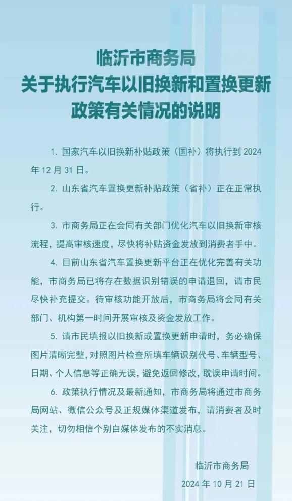 根据山东省商务厅等7部门《关于印发<2024年山东省汽车置换更新补贴实施细则>的通知》(鲁商字〔2024〕118号)要求,在全市范围内实施汽车置换更新补贴政策,现将《2024年临沂市汽车置换更新补贴实施细则》印发你们,请抓好贯彻执行。