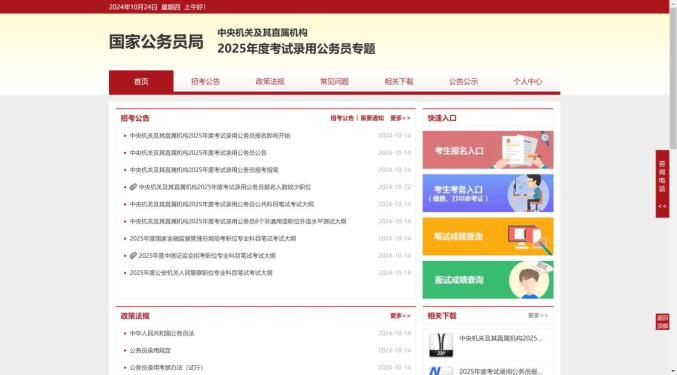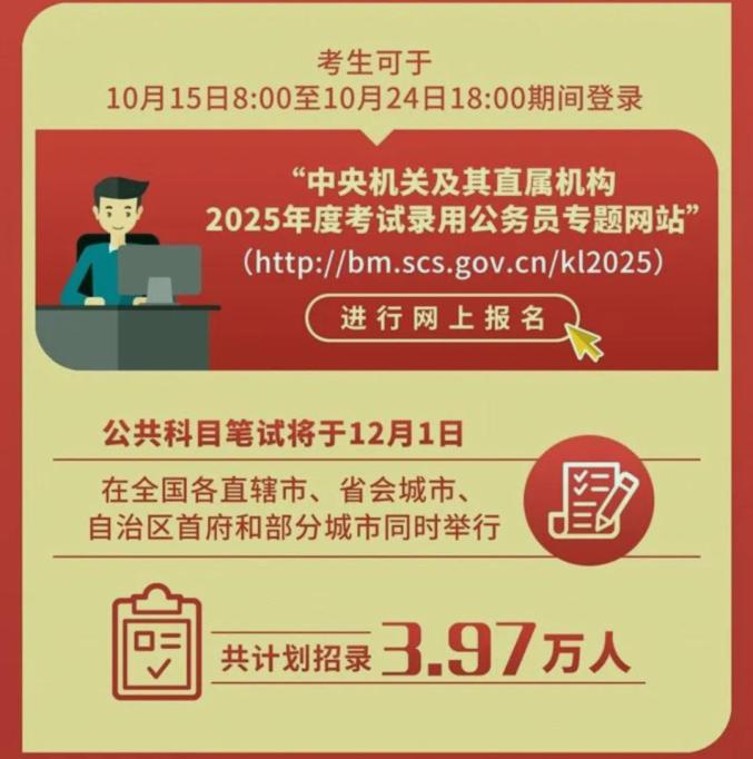 考生可于10月15日8:00至10月24日18:00期间登录“中央机关及其直属机构2025年度考试录用公务员专题网站”进行网上报名: