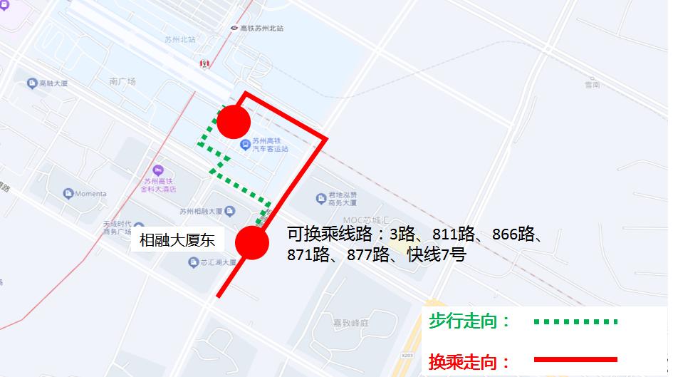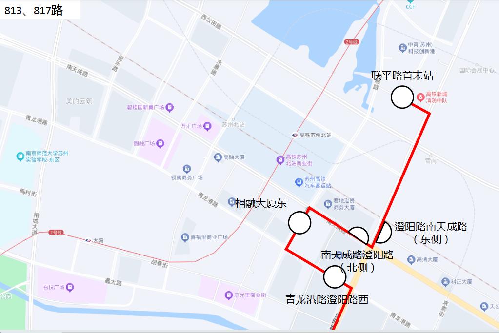 83路、83路区间线、84路、813路、813路区间线、817路、823路、867路等8条线路通过临时增加停靠“相融大厦东”公交站台后直达联平路首末站,如需前往苏州北站,乘客可通过乘坐3路、811路、866路、871路、877路、快线7号等6条公交线路,或者步行约600米前往。