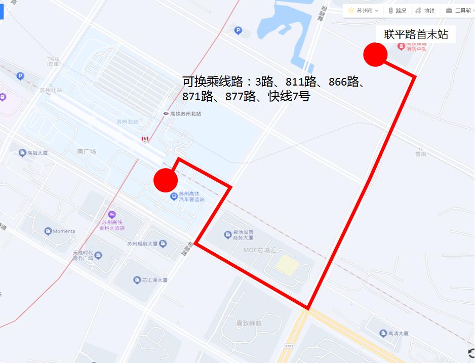 3路、811路、866路、871路、877路、快线7号、夜4路、夜9路等8条线路,受场站建设影响,京沪高铁苏州北站首末站内现有的8条上客通道取消并调整至首末站内出口通道上。其中,出联平路首末站方向的线路上客点调整为现1号乘车通道北侧,进联平路首末站方向线路上客点调整为现3号乘车通道北侧。