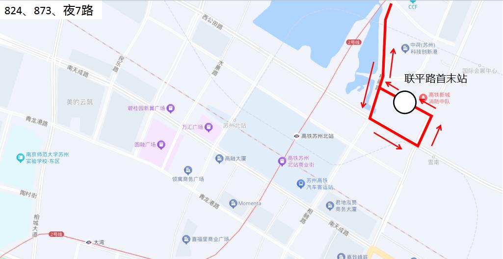 另外,公交824路、873路、夜7路等3条线路临时截短至联平路首末站,如需乘坐轨道交通,需在骑河站下车进行换乘;如需前往高铁北站,乘客可在联平路首末站公交站台换乘前往京沪高铁苏州北站的公交线路。