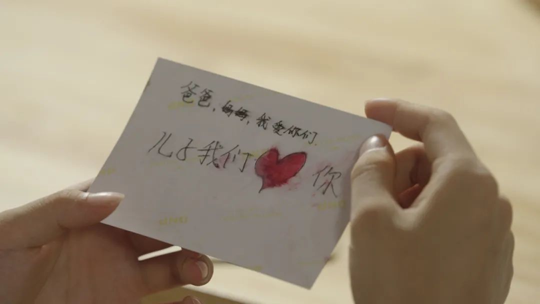 翻过照片,背后一串文字令人泪目,稚嫩的笔触刻写着看似简单的爱意:“爸爸,妈妈,我爱你们!”