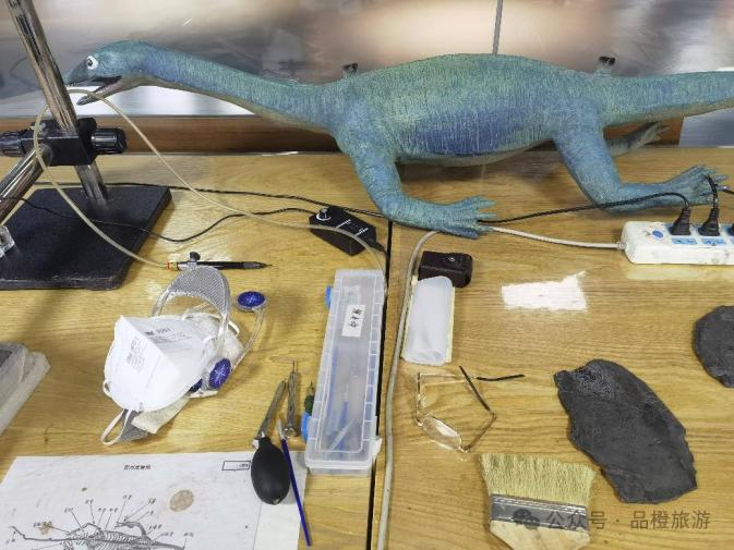 王云忠工作室一角保护和利用并向进行,许多人也由此改变了自己一生的命运。2013年,地质公园组织当地村民进行化石修复技术培训学习,在大块岩石中雕刻出骨架纹理。王云忠和他的妻子王美英自那时起踏入这个陌生而枯燥的领域,自学生物专业书籍,了解国际前沿研究,以农民身份毅然投入科研科普的汪洋大海。十余年过去,王云忠在显微镜下转动气动风刻笔时的神情始终坚定,他的生活中依然没有多余的娱乐,他也依然会梦见自己修复的鱼龙化石复活,浮潜游泳。而他工作室旁的贵州龙化石原位保护馆内,实地采集化石残片、制作化石模型、体验化石修复等沉浸式项目吸引来一批又一批的亲子家庭和研学团,因为一块距今2亿年的化石,他们中的一些人可能就此踏上古生物的道路。