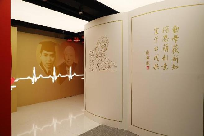 纪念展以一本摊开的书造型开始,寓意着上医精神、中山精神、院士精神的传承。“勤学获新知,深思萌创意,实干出成果”,陈灏珠院士的座右铭镌刻于书页上,旁边正是院士正在笔耕不辍的线描画。