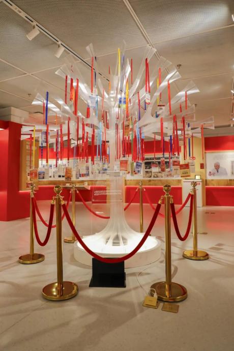 “生命之树”以一棵繁茂生长的树为象征,树干表面垂吊着陈灏珠院士历次参加国内外会议的胸牌,纪念他在医学领域的卓越贡献。