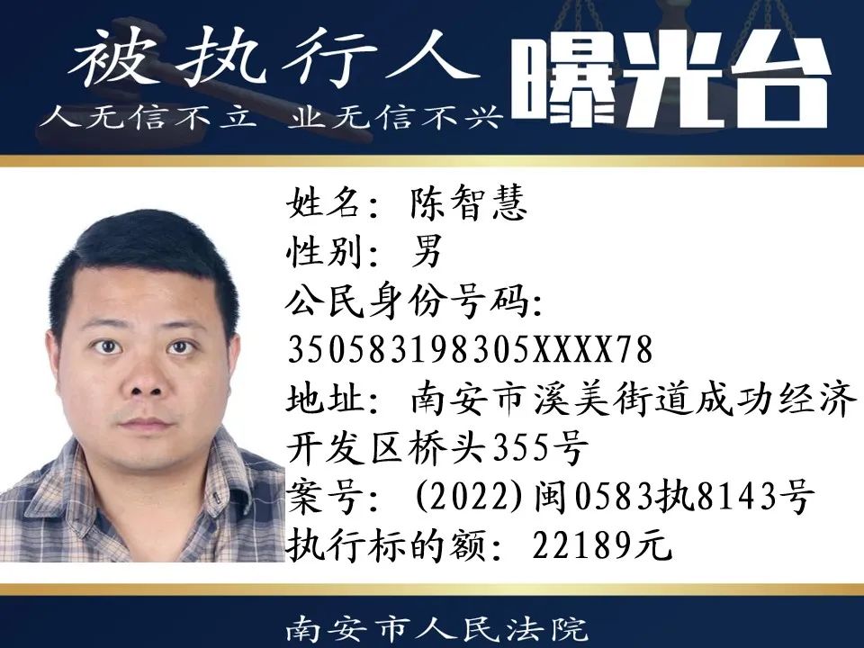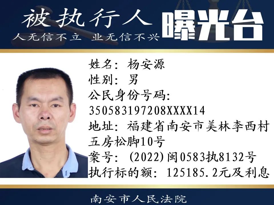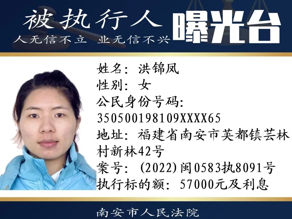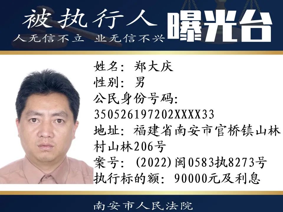 原标题:《关注!南安新增一批失信被执行人(2024年第60期)》