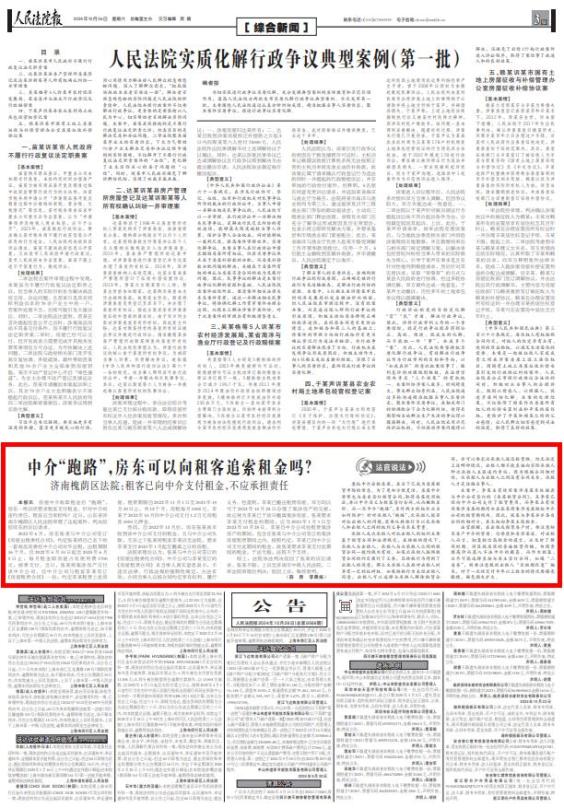 人民法院报三版刊发槐荫法院案例:中介“跑路”,房东可以向租客追索租金吗?