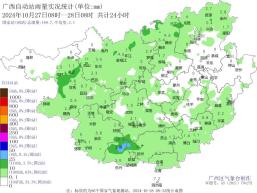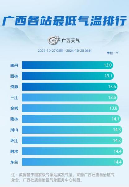 昨天08时到今天08时,受冷空气及台风外围环流影响,广西大部出现小雨天气,尤其沿海地区和北部湾海面风力较大,涠洲岛石油平台24小时极大风速达到22.5米/秒。早晚天气较凉,全区大部最低气温在1字头区间。