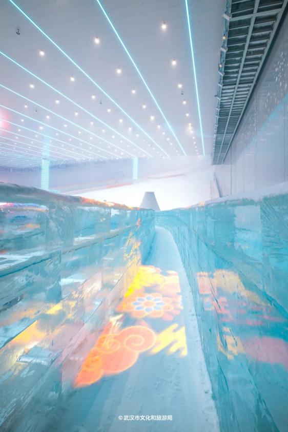 真冰制作,高透明,随着灯光变化成紫蓝红黄各种颜色,特别闪耀。正式开放后,你可以坐在充气雪圈上呲溜滑到底,过瘾!