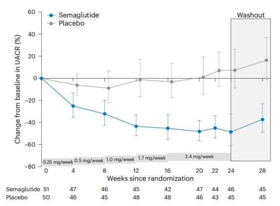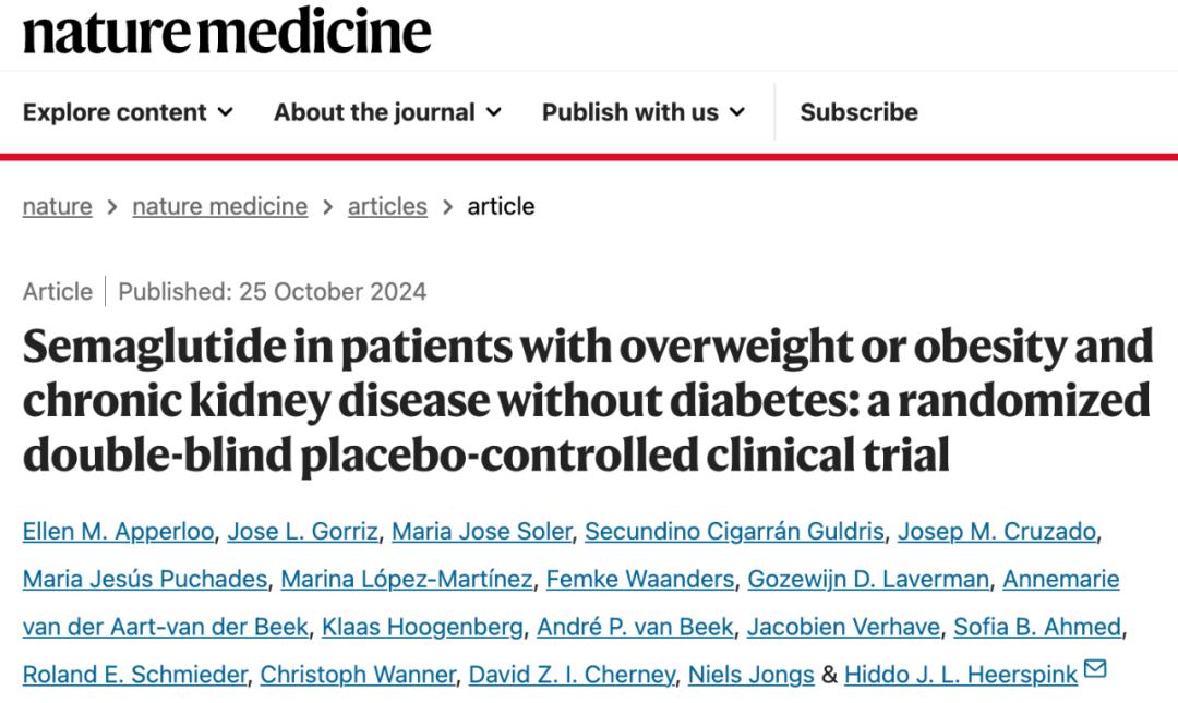 2024年10月25日,格罗宁根大学的研究人员在国际顶尖医学期刊 Nature Medicine 上发表了题为:Semaglutide in patients with overweight or obesity and chronic kidney disease without diabetes: a randomized double-blind placebo-controlled clinical trial 的临床研究论文。