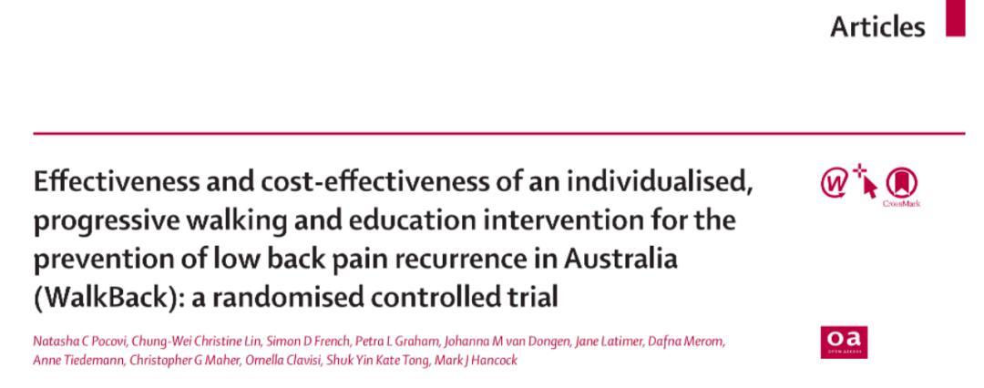 [5]Pocovi NC,Lin CC,French SD,Graham PL,van Dongen JM,Latimer J,Merom D,Tiedemann A,Maher CG,Clavisi O,Tong SYK,Hancock MJ.Effectiveness and cost-effectiveness of an individualised,progressive walking and education intervention for the prevention of low back pain recurrence in Australia(WalkBack):a randomised controlled trial.Lancet.2024 Jun 19:S0140-6736(24)00755-4.