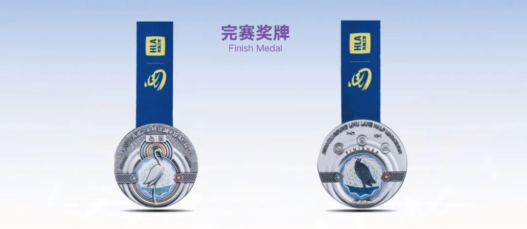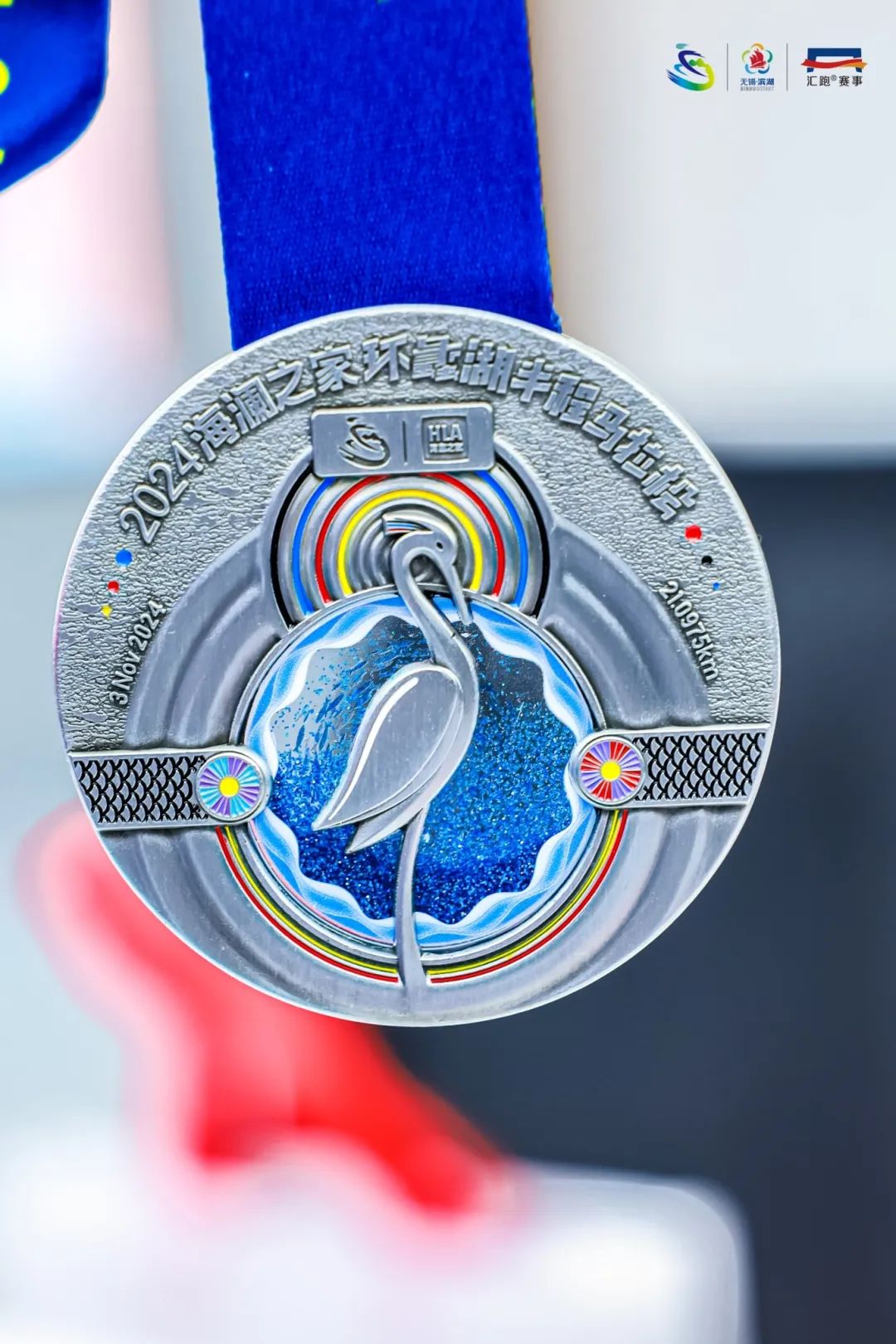 奖牌设计以蠡湖的生态为出发点,奖牌正面以代表自然的白鹭为视觉中心,其头部周围呈现出放射的光环;白鹭的下方则由轻沙和重沙组成小装置,鱼群在二者相互切换间若隐若现、活灵活现,带来更多的趣味性;周围则是起伏的波纹,映射蠡湖的水;横向的圆环和鱼鳞贯穿其中。奖牌背面的下方融入了拱桥元素,整体奖牌简洁而大气。这枚蕴含了精巧构思的奖牌,希望成为所有选手蠡湖半马完赛的最好见证与礼物。