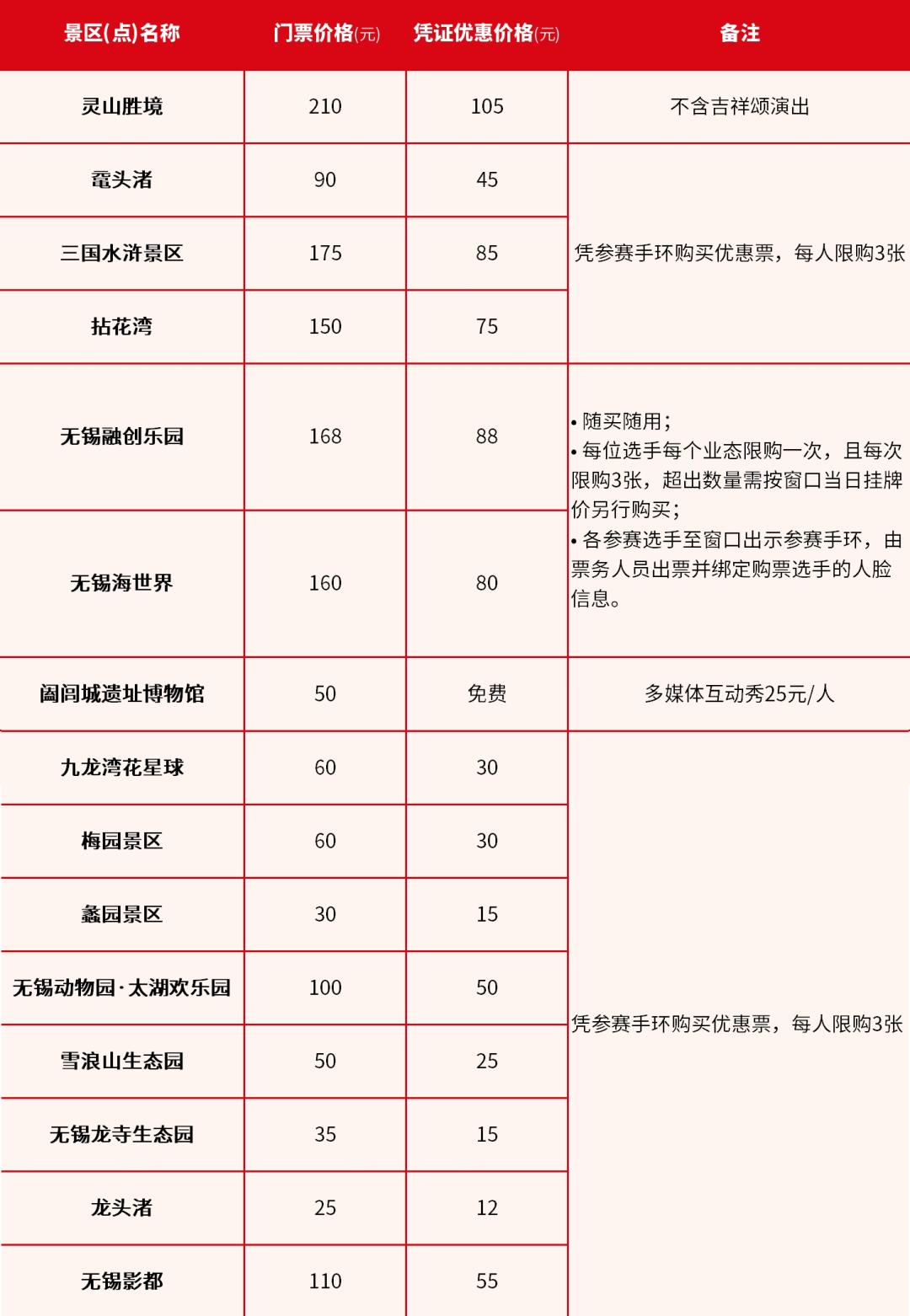 为了让所有外地跑者多角度、全方位、深一度地感受滨湖的秋日脉搏,11月2日—11月4日期间,组委会还为所有的参赛选手提供包括灵山胜境、鼋头渚、三国水浒城、拈花湾、融创乐园在内的15个景区景点门票的半价优惠政策,让大家更进一步感受最美湖湾的蓬勃活力与滨湖文体旅的完美融合。