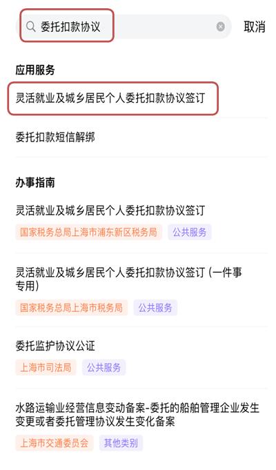 第一步:登录随申办App,首页上方搜索“委托扣款协议”,选择【灵活就业及城乡居民个人委托扣款协议签订】。
