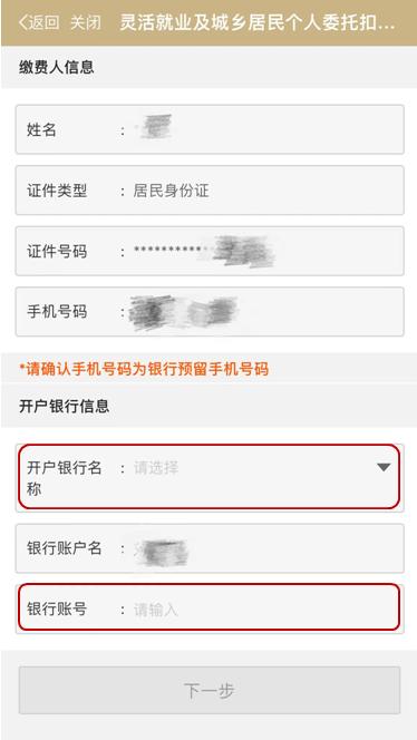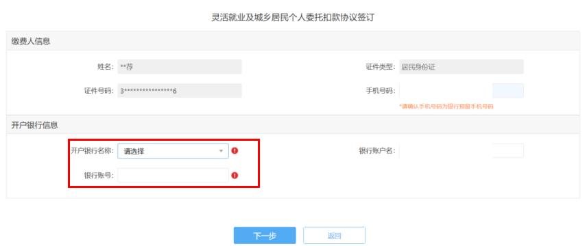 第二步:进入灵活就业及城乡居民个人委托扣款协议签订界面,缴费人信息由系统自动带出,缴费人需填写“银行预留手机号码”,选择“开户银行名称”,输入“银行账号”后,点击“下一步”。