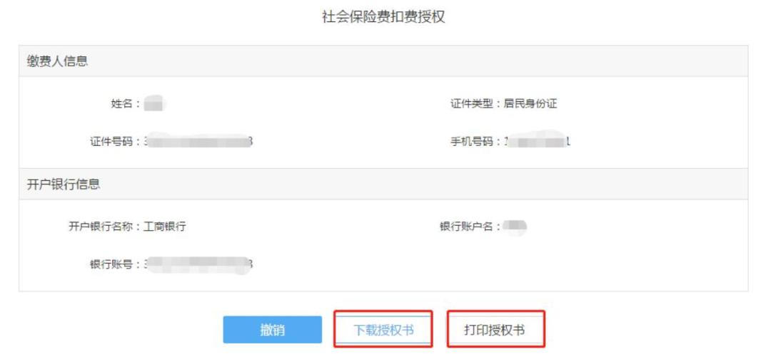 点击“查看授权信息”,即可弹出【社会保险费扣费授权】界面,缴费人可自行选择“下载授权书”或“打印授权书”。