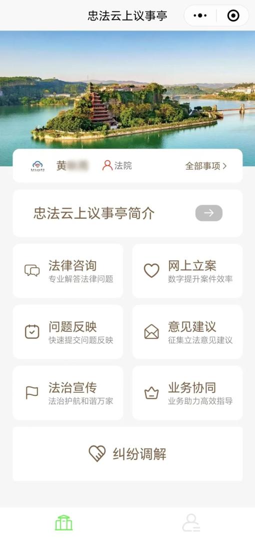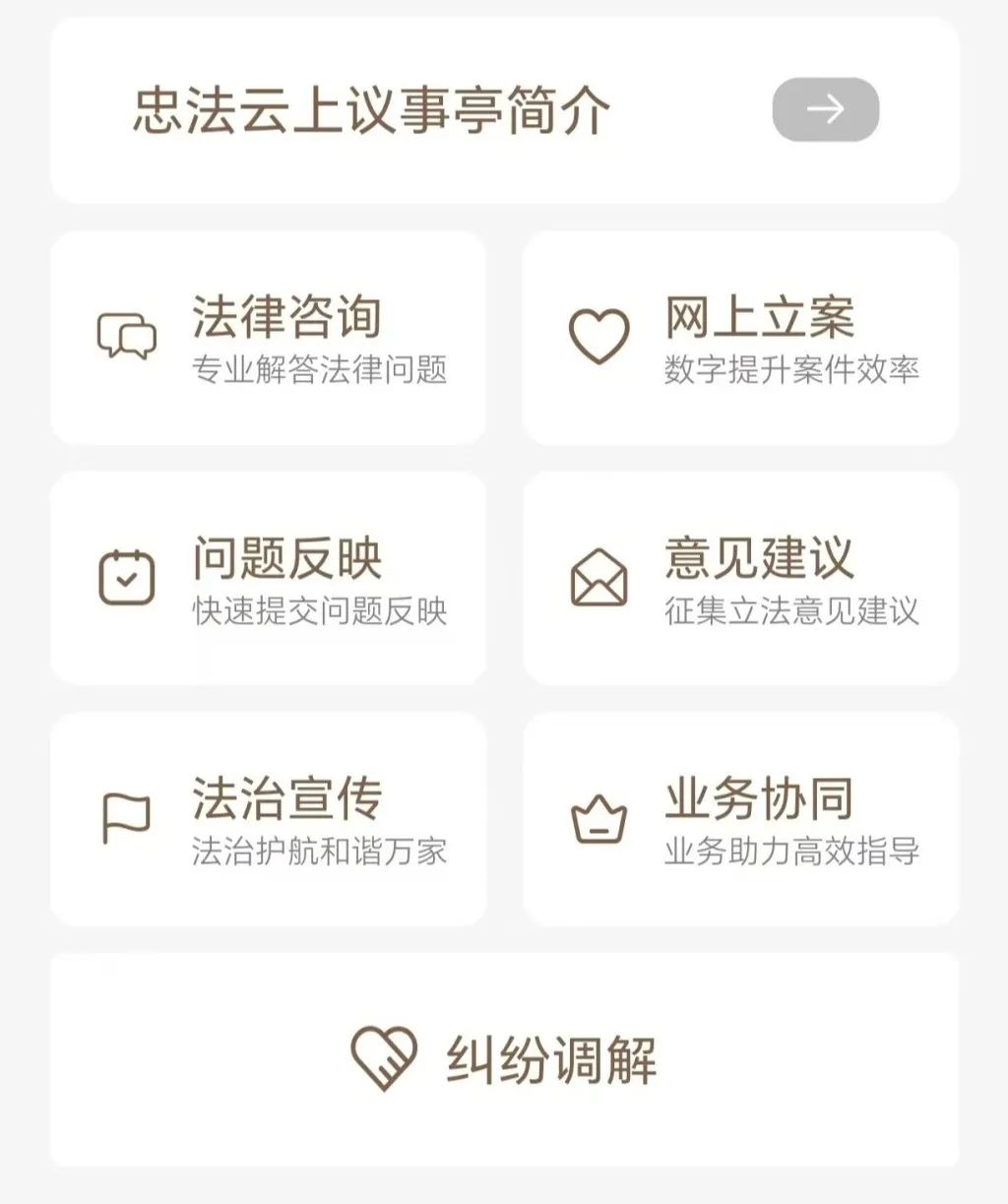 “忠法云上议事亭”集成纠纷调解、法律咨询、网上立案、问题反映、意见建议、法治宣传、业务协同等7个功能板块,提供矛盾纠纷调处、法律问题解答、网上立案指引、日常问题反映、立法意见征求、普法需求报送、线上业务协同等智慧服务。