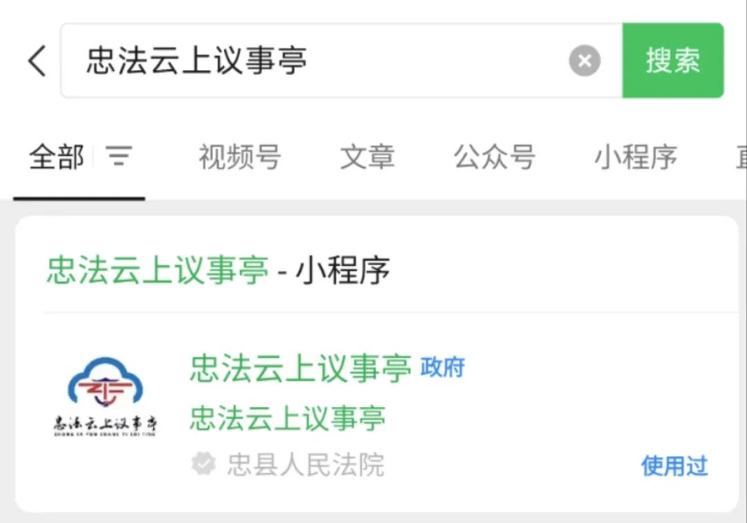 三是进入微信小程序,搜索“忠法云上议事亭”。