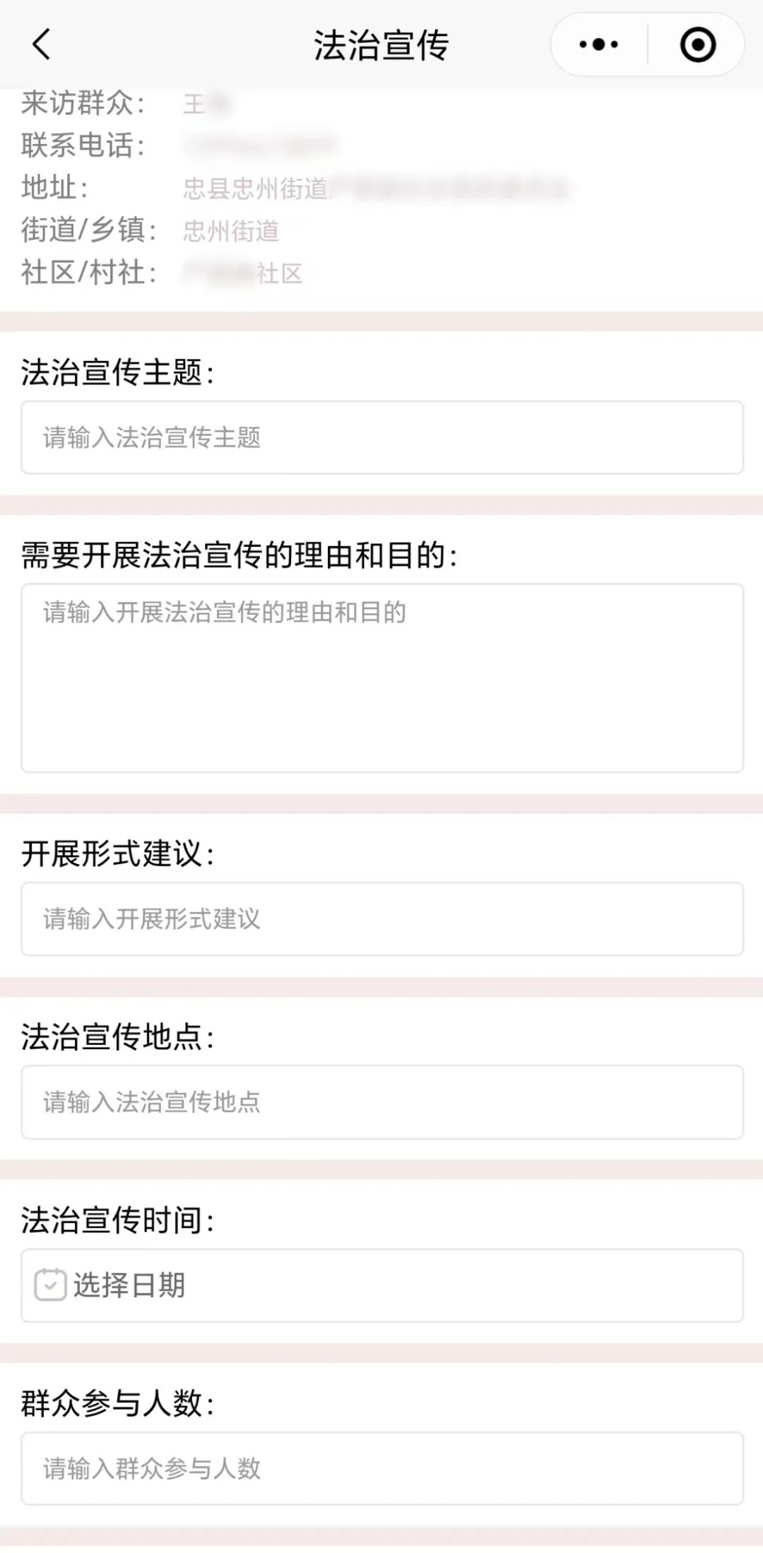 如果您是群众进入“忠法云上议事亭”首页后,需选择“群众”身份,并准确填写基本信息,方便村社干部、法院干警联系,了解诉求和建议。