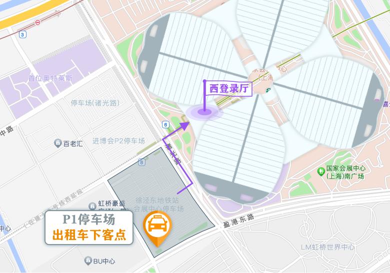 国家会展中心周边共设置5个即停即走下客点,出租车可以前往下客,分别为:“进博会P1停车场”(开放时间7:00—20:00)、“进博会P6停车场”(开放时间7:00—12:00)、“进博会P8停车场”(开放时间7:00—17:00)、“进博会P15停车场”(开放时间7:00—20:00)和“华翔路1535号停车场”(开放时间7:00—20:00)。