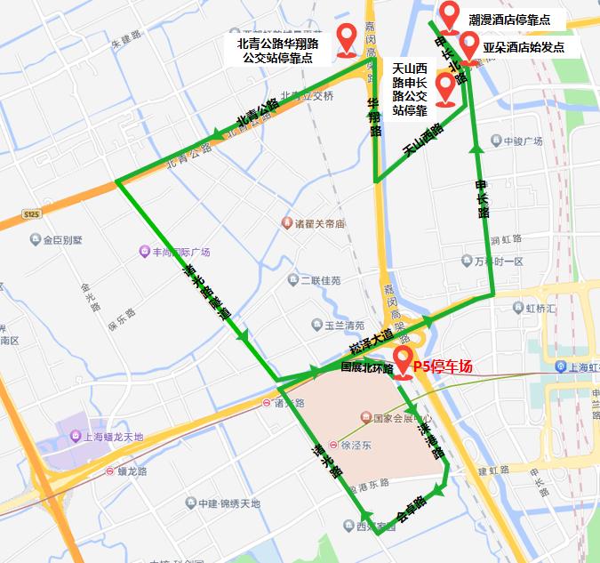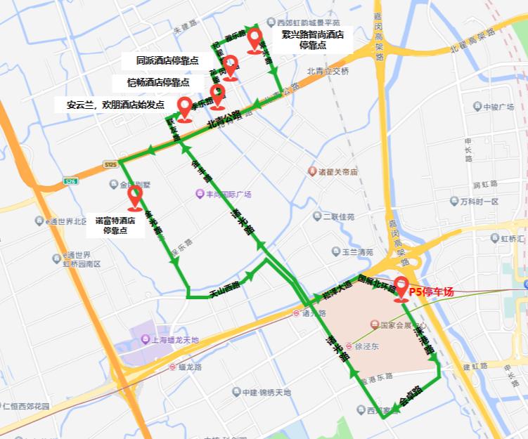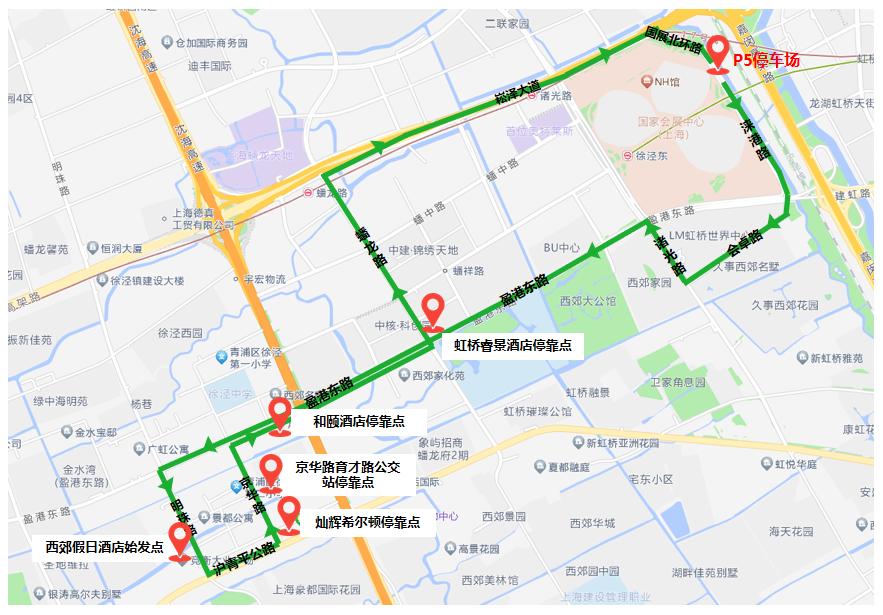 P17停车场内、国家会展中心北广场、P5停车场内。(8:00-14:00,中途经停国家会展中心北广场(只下客不上客);14:00后,直达P5停车场,中途不经停国家会展中心北广场。