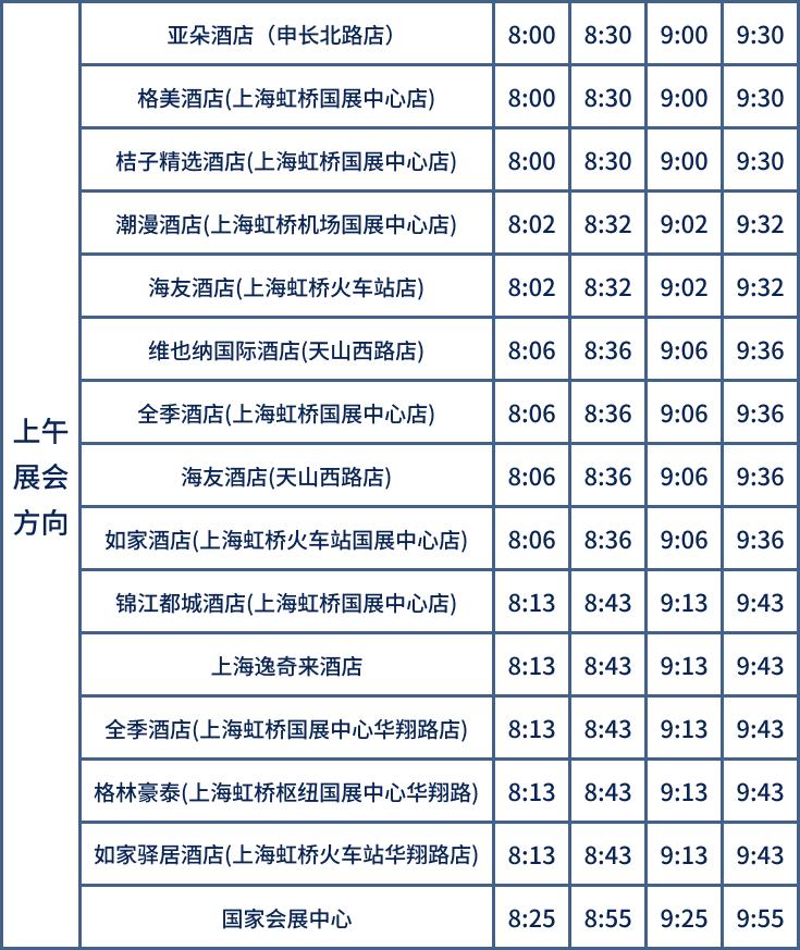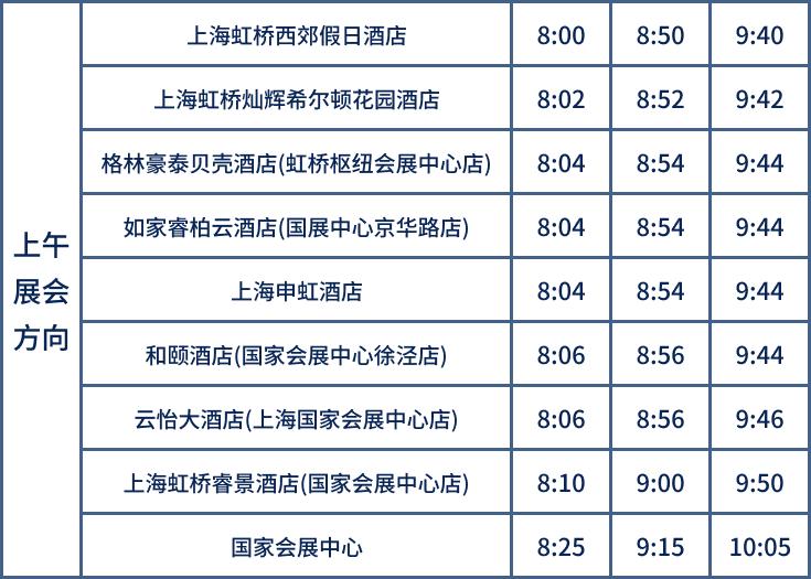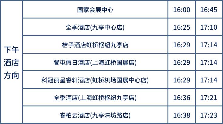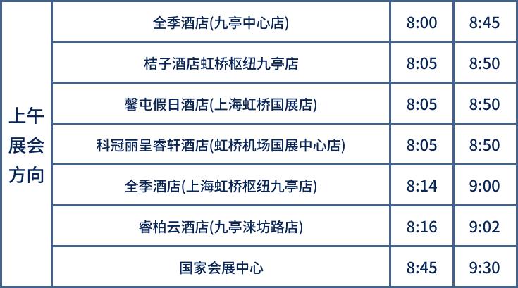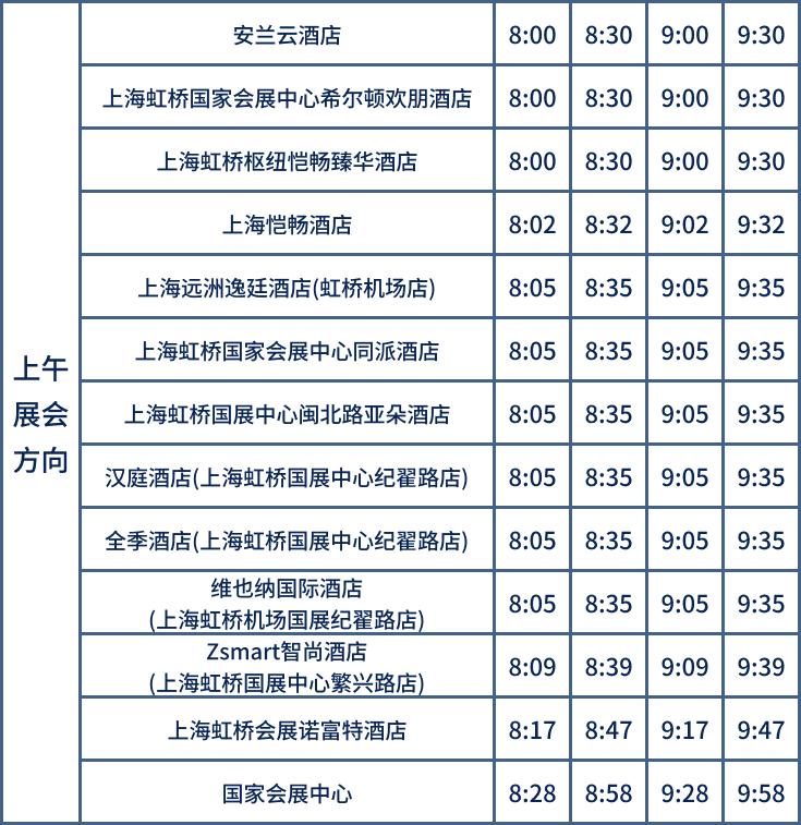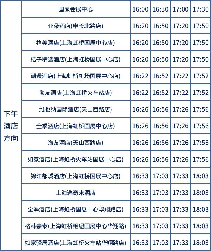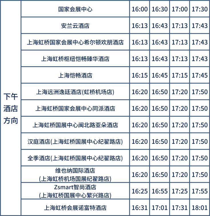 11月5日-10日,开通4条酒店穿梭巴士,覆盖40家酒店,提供国家会展中心至周边酒店密集区的交通服务。上午酒店到国家会展中心的运行时间为8:00至10:00,班次间隔为30分钟—50分钟。