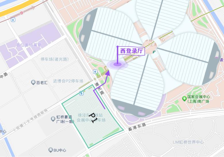 从P1停车场出发,沿场内人行通道步行至诸光路徐民东路路口,登上二层步廊,沿二层步廊向东继续步行,最终到达国家会展中心西登录厅。