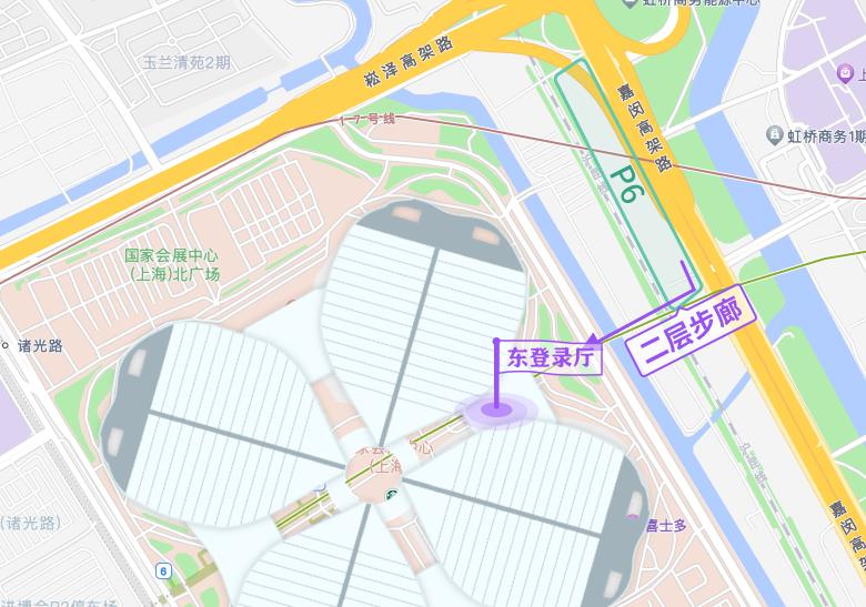 从P6停车场出发,登上二层步廊,沿二层步廊向西继续步行,最终到达国家会展中心东登录厅。