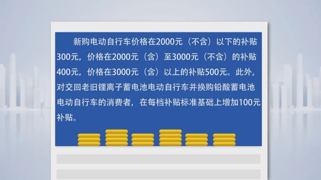 补贴标准按照新购电动自行车价格分档实施。其中,新购电动自行车价格在2000元(不含)以下的补贴300元,价格在2000元(含)至3000元(不含)的补贴400元,价格在3000元(含)以上的补贴500元。此外,对交回老旧锂离子蓄电池电动自行车并换购铅酸蓄电池电动自行车的消费者,在每档补贴标准基础上增加100元补贴。在此基础上,不少销售门店还额外推出了品牌优惠,让消费者享受更多实惠。