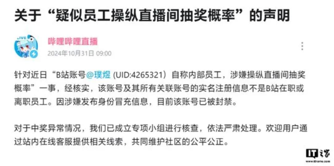 10月31日,“哔哩哔哩直播”发布关于“疑似员工操纵直播间抽奖概率”的声明:针对近日“B站账号'璞煜' (UID:4265321)自称内部员工,涉嫌操纵直播间抽奖概率”一事,经核实,该账号及其所有关联账号的实名注册信息不是B站在职或离职员工。因涉嫌发布身份冒充信息,目前该账号已被封禁。